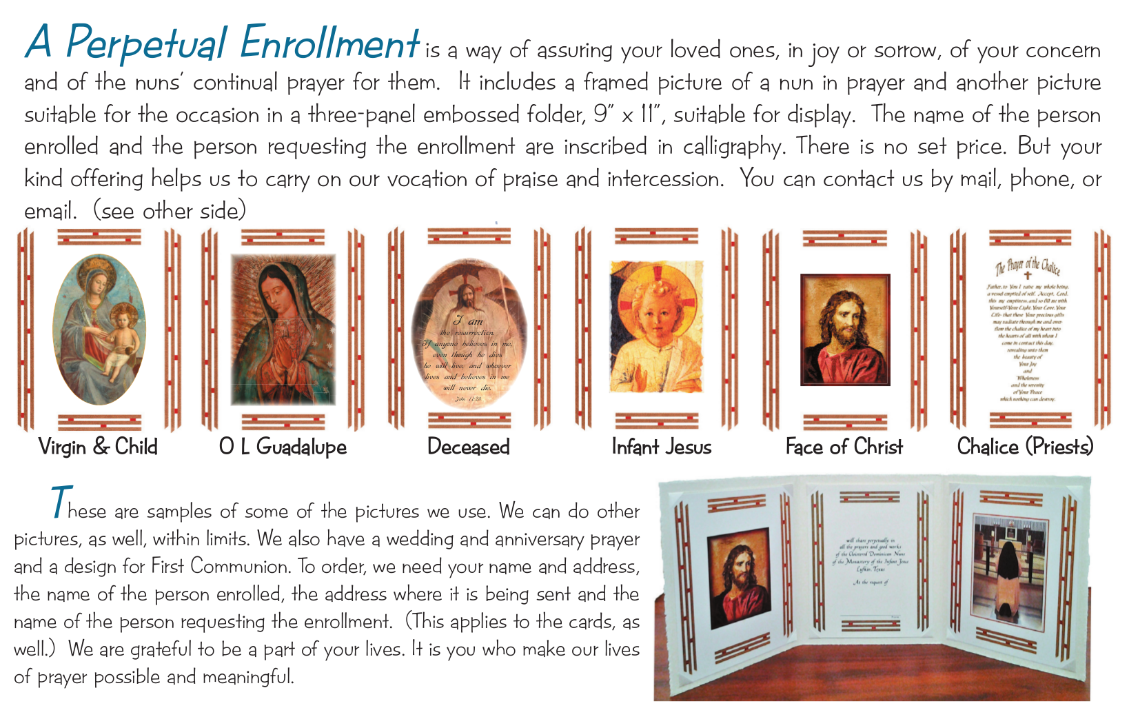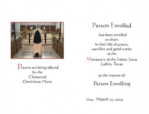 We also have two sizes of Perpetual Enrollments, which give the recipient a share in the prayers and good works of the nuns at the Monastery forever!