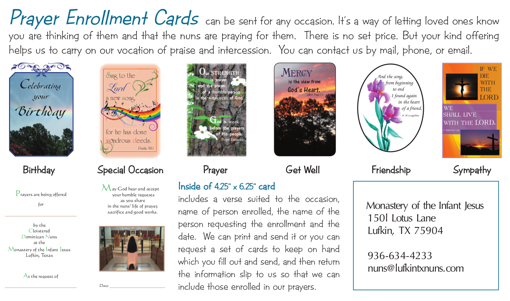 We have prayer cards for general intentions, special occasions, birthdays, healing, memorials and our new friendship enrollment as well. We offer